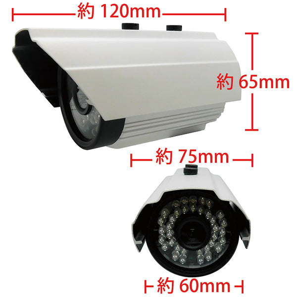 カメラ1台、モニター1台、電源アダプター、電源分岐線、ケーブル、変換コネクタスタンド、両面テープ